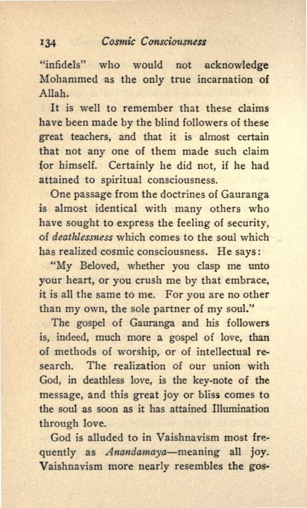 One passage from the doctrines of Gauranga is almost identical with many others who have sought to express the feeling of security, of deathlessness which comes to the soul which has realized cosmic consciousness. He says: