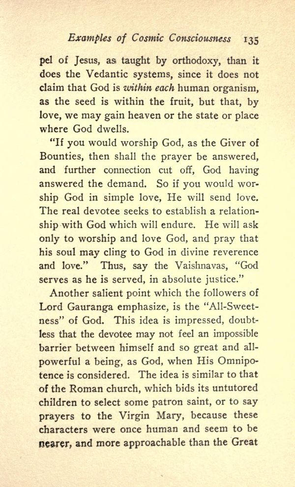 Another salient point which the followers of Lord Gauranga emphasize, is the "All-Sweetness" of God. This idea is impressed, doubtless that the devotee may not feel an impossible barrier between himself and so great and all-powerful a being, as God, when His Omnipotence is considered. The idea is similar to that of the Roman church, which bids its untutored children to select some patron saint, or to say prayers to the Virgin Mary, because these characters were once human and seem to be nearer, and more approachable than the Great
