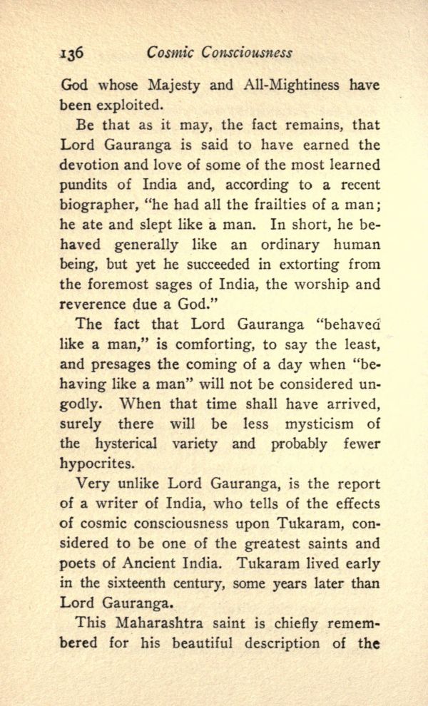 Very unlike Lord Gauranga, is the report of a writer of India, who tells of the effects of cosmic consciousness upon Tukaram, considered to be one of the greatest saints and poets of Ancient India. Tukaram lived early in the sixteenth century, some years later than Lord Gauranga.