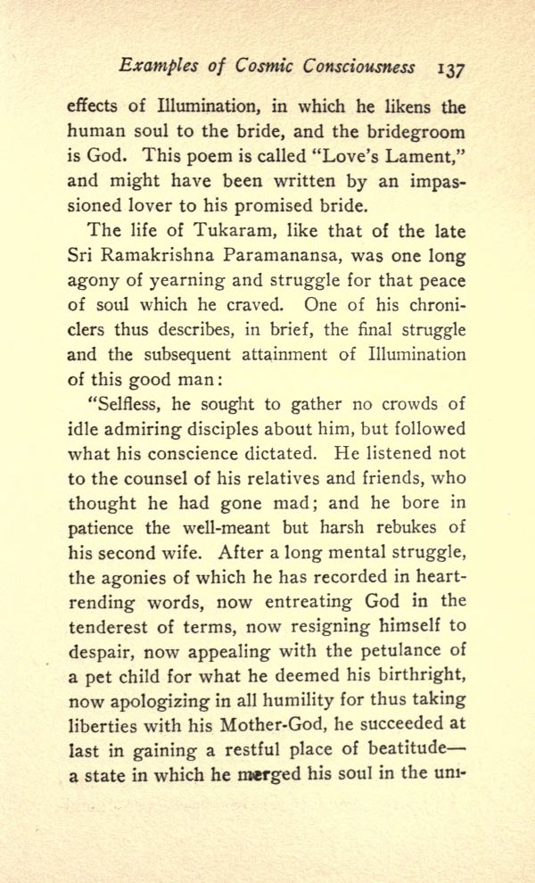 The life of Tukaram, like that of the late Sri Ramakrishna Paramanansa, was one long agony of yearning and struggle for that peace of soul which he craved. One of his chroniclers thus describes, in brief, the final struggle and the subsequent attainment of Illumination of this good man: