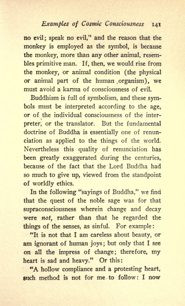 no evil; speak no evil," and the reason that the monkey is employed as the symbol, is because the monkey, more than any other animal, resembles primitive man. If, then, we would rise from the monkey, or animal condition (the physical or animal part of the human organism), we must avoid a karma of consciousness of evil.
