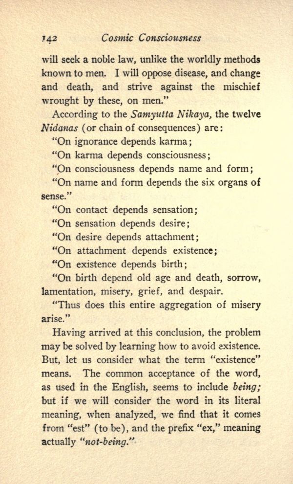 Having arrived at this conclusion, the problem may be solved by learning how to avoid existence. But, let us consider what the term "existence" means. The common acceptance of the word, as used in the English, seems to include being; but if we will consider the word in its literal meaning, when analyzed, we find that it comes from "est" (to be), and the prefix "ex," meaning actually " not-being."