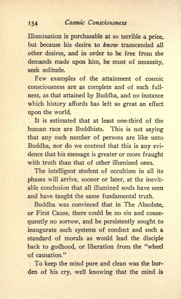 Few examples of the attainment of cosmic consciousness are as complete and of such fullness, as that attained by Buddha, and no instance which history affords has left so great an effect upon the world.