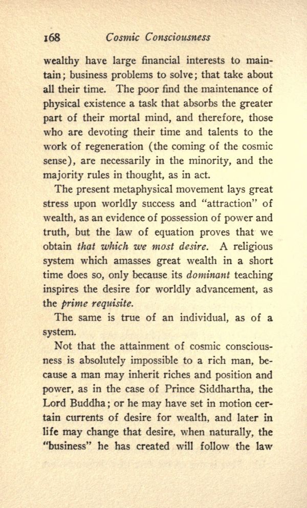 Not that the attainment of cosmic consciousness is absolutely impossible to a rich man, because a man may inherit riches and position and power, as in the case of Prince Siddhartha, the Lord Buddha; or he may have set in motion certain currents of desire for wealth, and later in life may change that desire, when naturally, the "business" he has created will follow the law