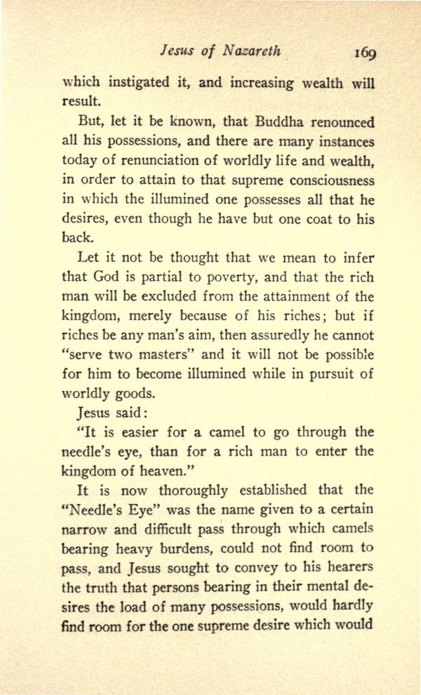 Let it not be thought that we mean to infer that God is partial to poverty, and that the rich man will be excluded from the attainment of the kingdom, merely because of his riches; but if riches be any man's aim, then assuredly he cannot "serve two masters" and it will not be possible for him to become illumined while in pursuit of worldly goods.