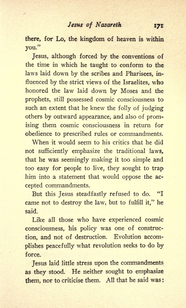 Jesus, although forced by the conventions of the time in which he taught to conform to the laws laid down by the scribes and Pharisees, influenced by the strict views of the Israelites, who honored the law laid down by Moses and the prophets, still possessed cosmic consciousness to such an extent that he knew the folly of judging others by outward appearance, and also of promising them cosmic consciousness in return for obedience to prescribed rules or commandments.