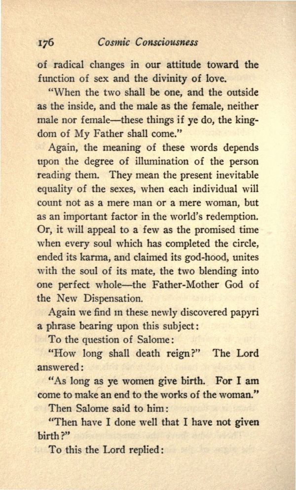 Again, the meaning of these words depends upon the degree of illumination of the person reading them. They mean the present inevitable equality of the sexes, when each individual will count not as a mere man or a mere woman, but as an important factor in the world's redemption. Or, it will appeal to a few as the promised time when every soul which has completed the circle, ended its karma, and claimed its god-hood, unites with the soul of its mate, the two blending into one perfect whole--the Father-Mother God of the New Dispensation.