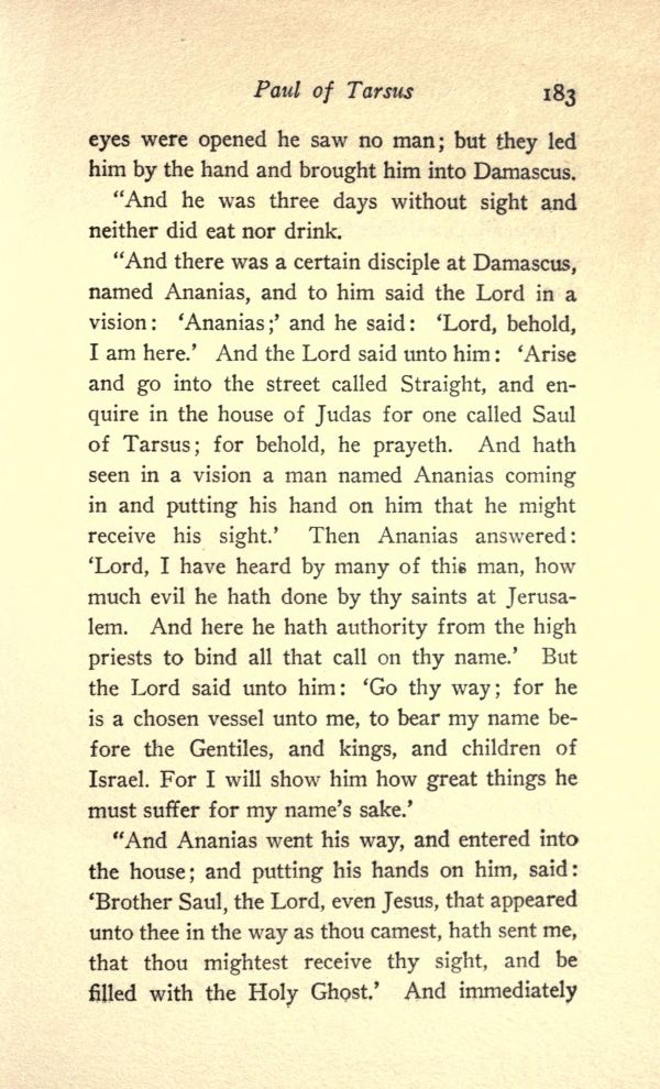 "And there was a certain disciple at Damascus, named Ananias, and to him said the Lord in a vision: 'Ananias;' and he said: 'Lord, behold, I am here.' And the Lord said unto him: 'Arise and go into the street called Straight, and enquire in the house of Judas for one called Saul of Tarsus; for behold, he prayeth. And hath seen in a vision a man named Ananias coming in and putting his hand on him that he might receive his sight.' Then Ananias answered: 'Lord, I have heard by many of this man, how much evil he hath done by thy saints at Jerusalem. And here he hath authority from the high priests to bind all that call on thy name.' But the Lord said unto him: 'Go thy way; for he is a chosen vessel unto me, to bear my name before the Gentiles, and kings, and children of Israel. For I will show him how great things he must suffer for my name's sake.'