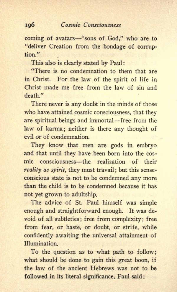 There never is any doubt in the minds of those who have attained cosmic consciousness, that they are spiritual beings and immortal--free from the law of karma; neither is there any thought of evil or of condemnation.