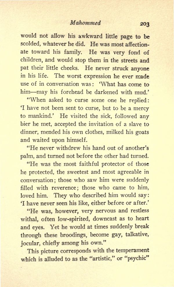 would not allow his awkward little page to be scolded, whatever he did. He was most affectionate toward his family. He was very fond of children, and would stop them in the streets and pat their little cheeks. He never struck anyone in his life. The worst expression he ever made use of in conversation was: 'What has come to him--may his forehead be darkened with mud.'