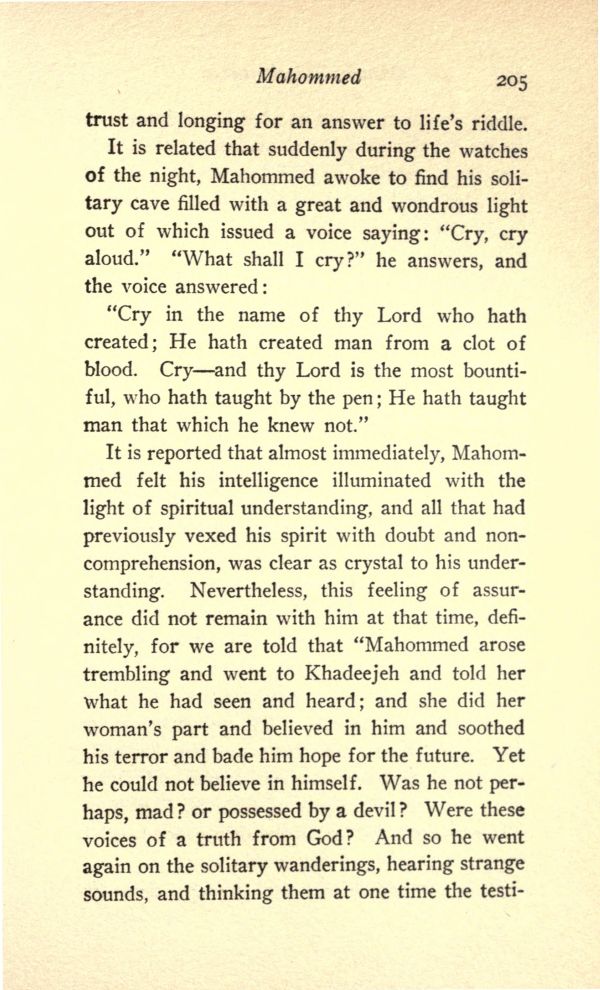 It is related that suddenly during the watches of the night, Mohammed awoke to find his solitary cave filled with a great and wondrous light out of which issued a voice saying: "Cry, cry aloud." "What shall I cry?" he answers, and the voice answered:
