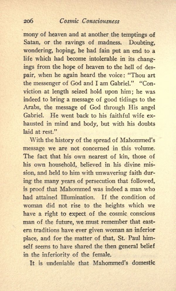 With the history of the spread of Mohammed's message we are not concerned in this volume. The fact that his own nearest of kin, those of his own household, believed in his divine mission, and held to him with unwavering faith during the many years of persecution that followed, is proof that Mohammed was indeed a man who had attained Illumination. If the condition of woman did not rise to the heights which we have a right to expect of the cosmic conscious man of the future, we must remember that eastern traditions have ever given woman an inferior place, and for the matter of that, St. Paul himself seems to have shared the then general belief in the inferiority of the female.