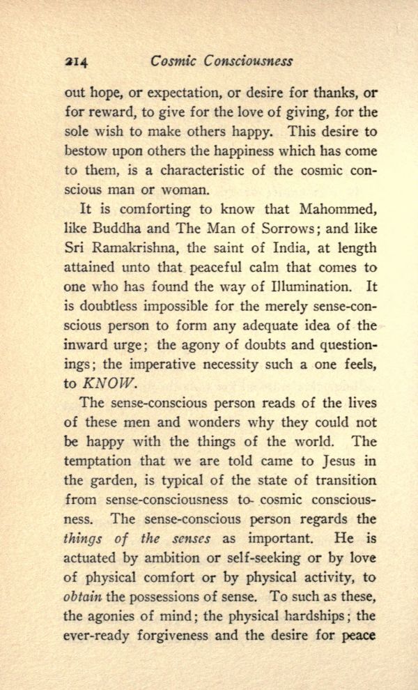 hope, or expectation, or desire for thanks, or for reward, to give for the love of giving, for the sole wish to make others happy. This desire to bestow upon others the happiness which has come to them, is a characteristic of the cosmic conscious man or woman.