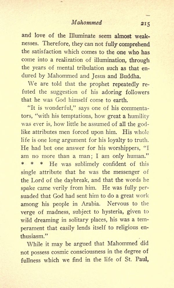 While it may be argued that Mohammed did not possess cosmic consciousness in the degree of fullness which we find in the life of St. Paul,