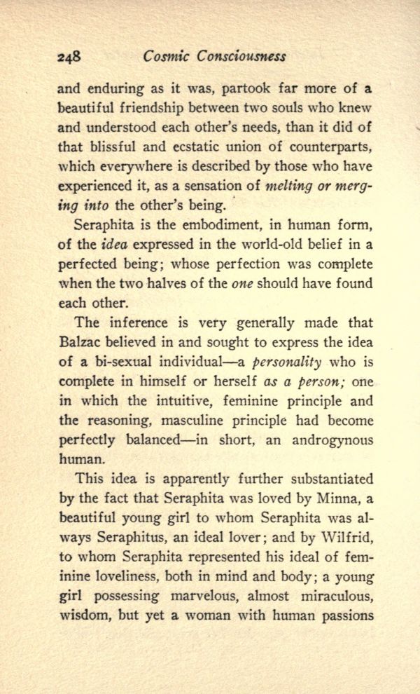 The inference is very generally made that Balzac believed in and sought to express the idea of a bi-sexual individual--a personality who is complete in himself or herself as a person; one in which the intuitive, feminine principle and the reasoning, masculine principle had become perfectly balanced--in short, an androgynous human.