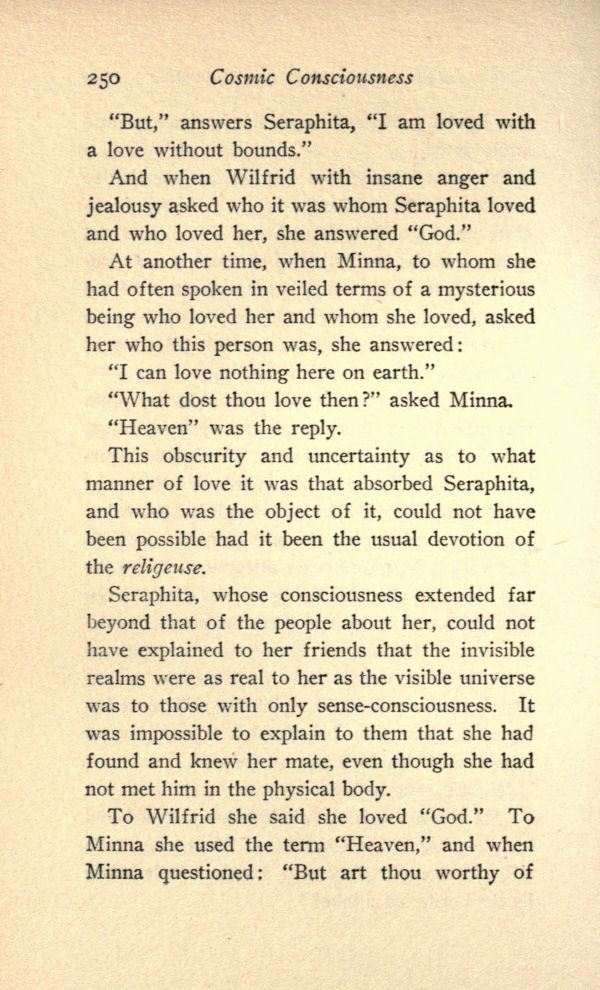 And when Wilfrid with insane anger and jealousy asked who it was whom Seraphita loved and who loved her, she answered "God."