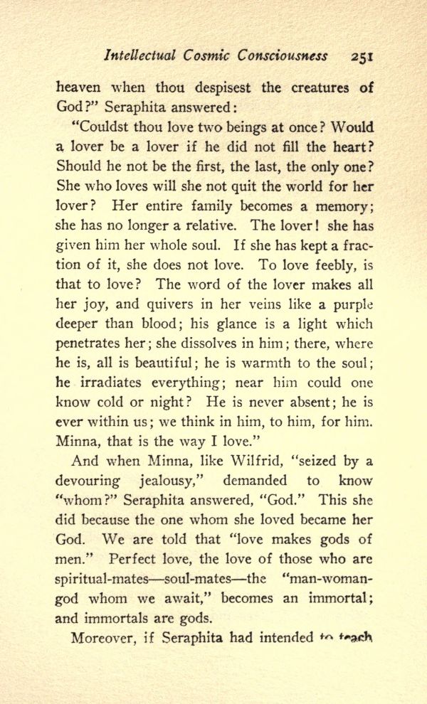 And when Minna, like Wilfrid, "seized by a devouring jealousy," demanded to know "whom?" Seraphita answered, "God." This she did because the one whom she loved became her God. We are told that "love makes gods of men." Perfect love, the love of those who are spiritual-mates--soul-mates--the "man-woman-god whom we await," becomes an immortal: and immortals are gods.