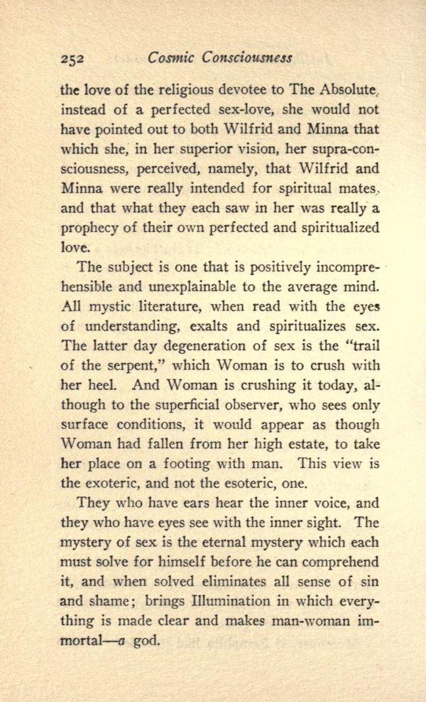 the love of the religious devotee to The Absolute instead of a perfected sex-love, she would not have pointed out to both Wilfrid and Minna that which she, in her superior vision, her supra-consciousness, perceived, namely, that Wilfrid and Minna were really intended for spiritual mates, and that what they each saw in her was really a prophecy of their own perfected and spiritualized love.