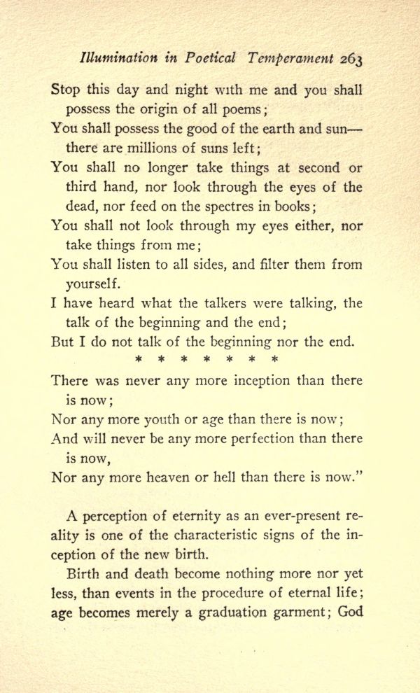 A perception of eternity as an ever-present reality is one of the characteristic signs of the inception of the new birth.