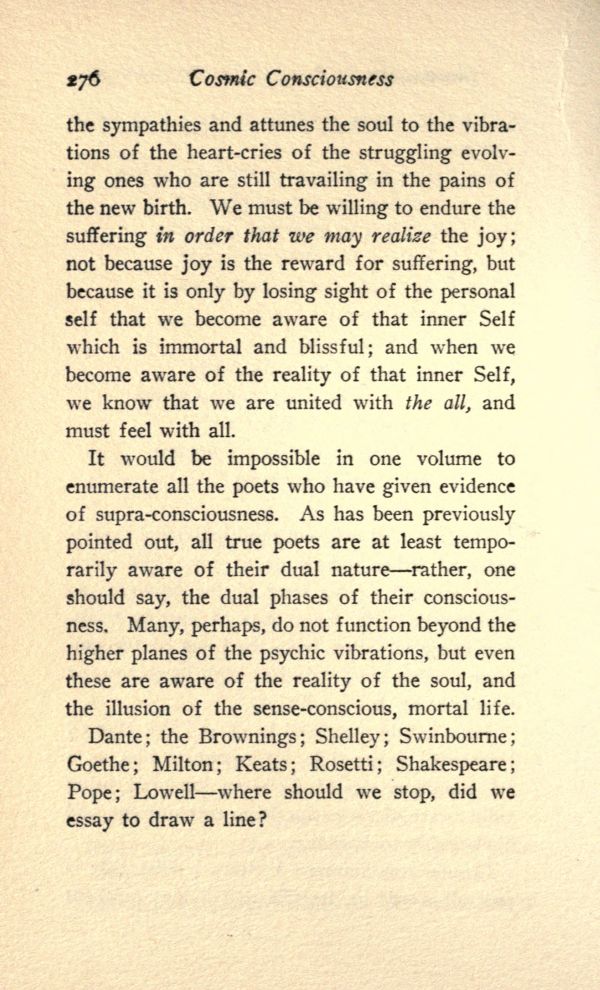 It would be impossible in one volume to enumerate all the poets who have given evidence of supra-consciousness. As has been previously pointed out, all true poets are at least temporarily aware of their dual nature--rather, one should say, the dual phases of their consciousness. Many, perhaps, do not function beyond the higher planes of the psychic vibrations, but even these are aware of the reality of the soul, and the illusion of the sense-conscious, mortal life.