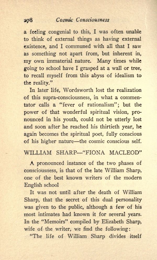 In later life, Wordsworth lost the realization of this supra-consciousness, in what a commentator calls a "fever of rationalism"; but the power of that wonderful spiritual vision, pronounced in his youth, could not be utterly lost and soon after he reached his thirtieth year, he again becomes the spiritual poet, fully conscious of his higher nature--the cosmic conscious self.
