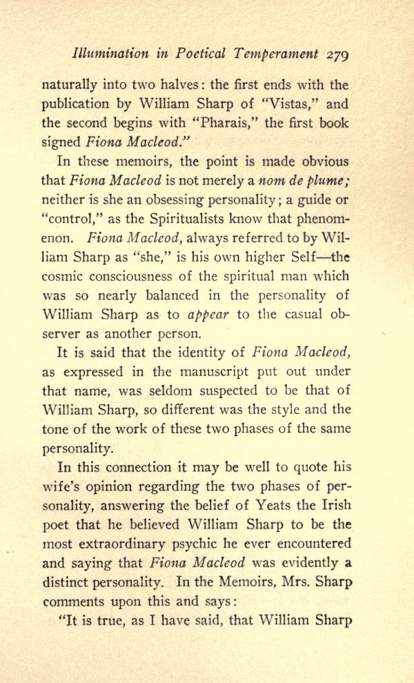 In these memoirs, the point is made obvious that Fiona Macleod is not merely a nom de plume; neither is she an obsessing personality; a guide or "control," as the Spiritualists know that phenomenon. Fiona Macleod, always referred to by William Sharp as "she," is his own higher Self--the cosmic consciousness of the spiritual man which was so nearly balanced in the personality of William Sharp as to appear to the casual observer as another person.