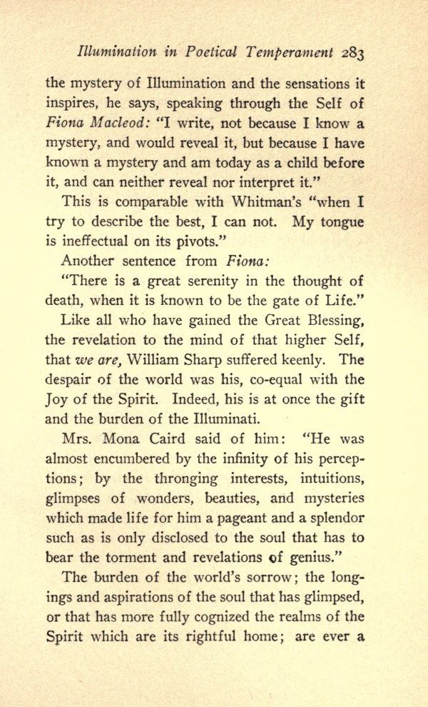 the mystery of Illumination and the sensations it inspires, he says, speaking through the Self of Fiona Macleod: "I write, not because I know a mystery, and would reveal it, but because I have known a mystery and am to-day as a child before it, and can neither reveal nor interpret it."