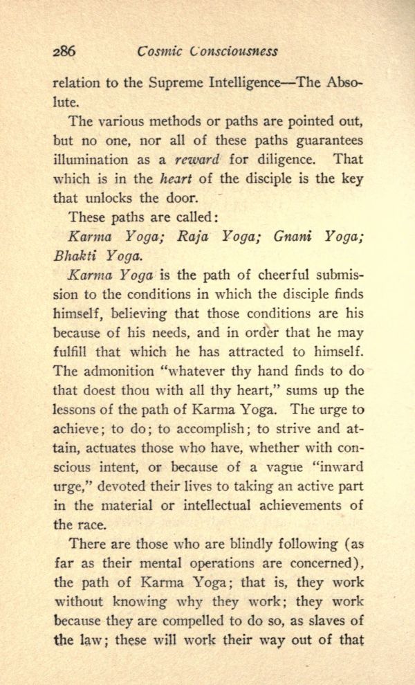 There are those who are blindly following (as far as their mental operations are concerned), the path of Karma Yoga; that is, they work without knowing why they work; they work because they are compelled to do so, as slaves of the law; these will work their way out of that