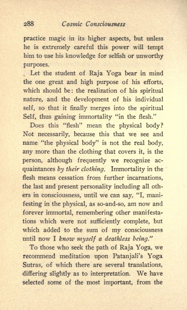 Does this "flesh" mean the physical body? Not necessarily, because this that we see and name "the physical body" is not the real body, any more than the clothing that covers it, is the person, although frequently we recognize acquaintances by their clothing. Immortality in the flesh means cessation from further incarnations, the last and present personality including all others in consciousness, until we can say, "I, manifesting in the physical, as so-and-so, am now and forever immortal, remembering other manifestations which were not sufficiently complete, but which added to the sum of my consciousness until now I know myself a deathless being."