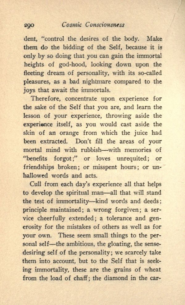 Therefore, concentrate upon experience for the sake of the Self that you are, and learn the lesson of your experience, throwing aside the experience itself, as you would cast aside the skin of an orange from which the juice had been extracted. Don't fill the areas of your mortal mind with rubbish--with memories of "benefits forgot;" or loves unrequited; or friendships broken; or misspent hours; or unhallowed words and acts.