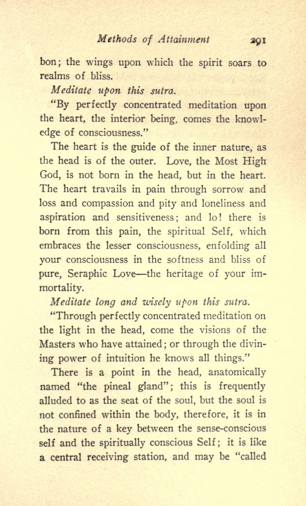 There is a point in the head, anatomically named "the pineal gland"; this is frequently alluded to as the seat of the soul, but the soul is not confined within the body, therefore, it is in the nature of a key between the sense-conscious self and the spiritually conscious Self; it is like a central receiving station, and may be "called