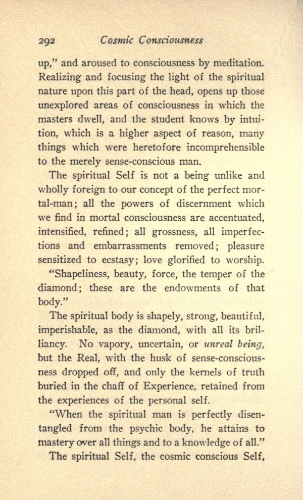 The spiritual body is shapely, strong, beautiful, imperishable, as the diamond, with all its brilliancy. No vapory, uncertain, or unreal being, but the Real, with the husk of sense-consciousness dropped off, and only the kernels of truth buried in the chaff of Experience, retained from the experiences of the personal self.