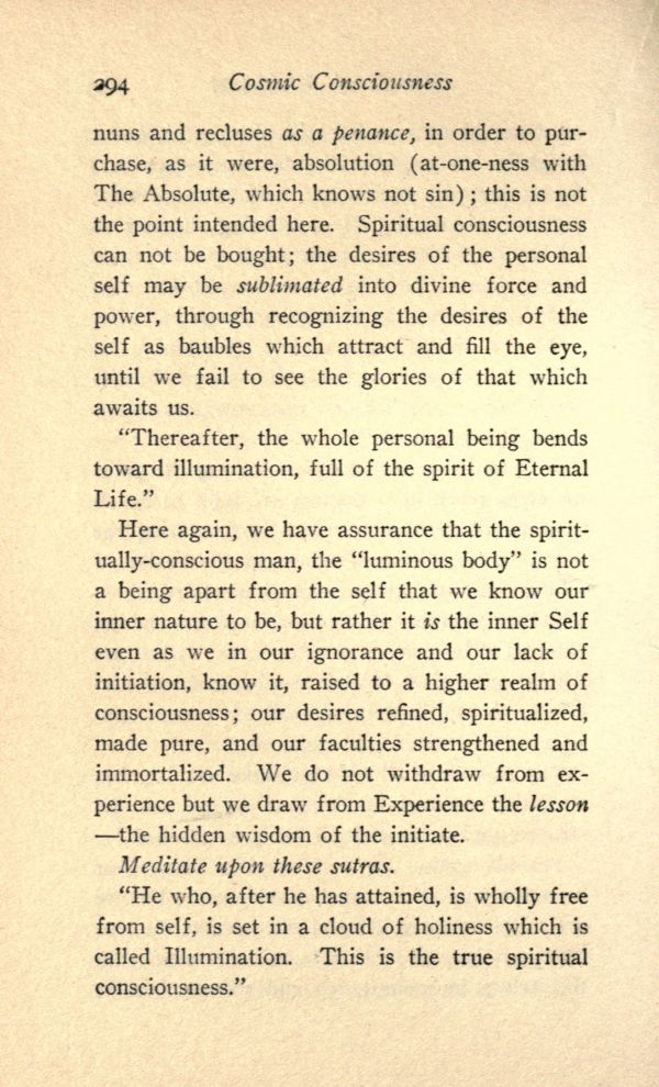Here again, we have assurance that the spiritually-conscious man, the "luminous body" is not a being apart from the self that we know our inner nature to be, but rather it is the inner Self even as we in our ignorance and our lack of initiation, know it, raised to a higher realm of consciousness; our desires refined, spiritualized, made pure, and our faculties strengthened and immortalized. We do not withdraw from experience but we draw from Experience the lesson --the hidden wisdom of the initiate.