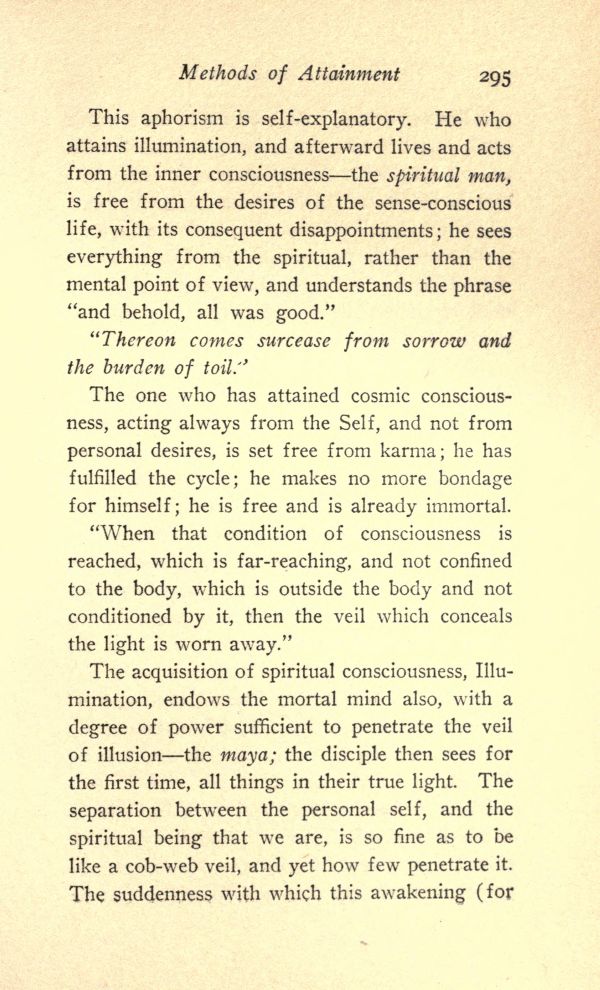 The acquisition of spiritual consciousness, Illumination, endows the mortal mind also, with a degree of power sufficient to penetrate the veil of illusion--the maya; the disciple then sees for the first time, all things in their true light. The separation between the personal self, and the spiritual being that we are, is so fine as to be like a cob-web veil, and yet how few penetrate it. The suddenness with which this awakening (for