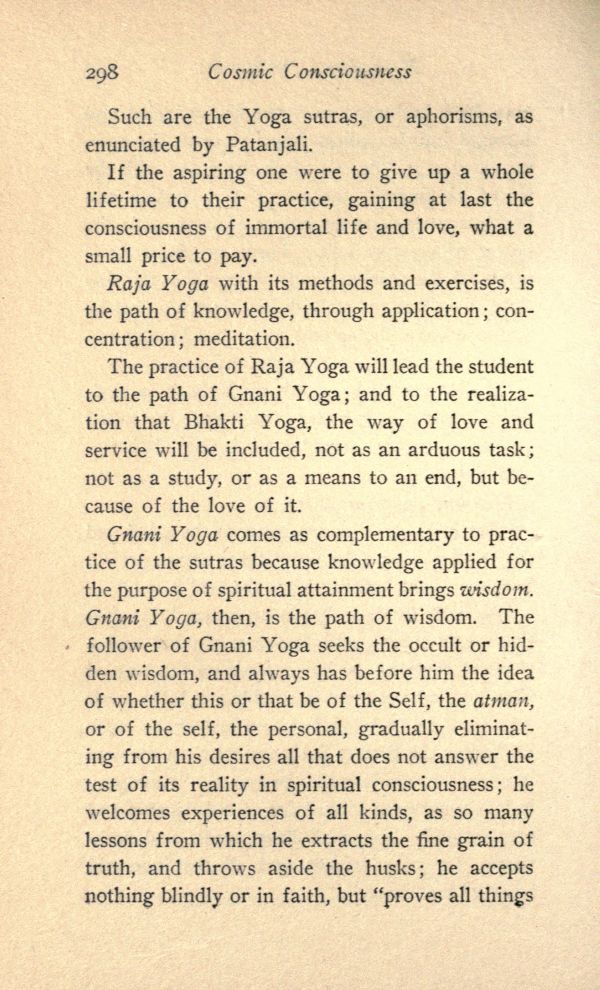 Gnani Yoga comes as complementary to practice of the sutras because knowledge applied for the purpose of spiritual attainment brings wisdom. Gnani Yoga, then, is the path of wisdom. The follower of Gnani Yoga seeks the occult or hidden wisdom, and always has before him the idea of whether this or that be of the Self, the atman, or of the self, the personal, gradually eliminating from his desires all that does not answer the test of its reality in spiritual consciousness; he welcomes experiences of all kinds, as so many lessons from which he extracts the fine grain of truth, and throws aside the husks; he accepts nothing blindly or in faith, but "proves all things