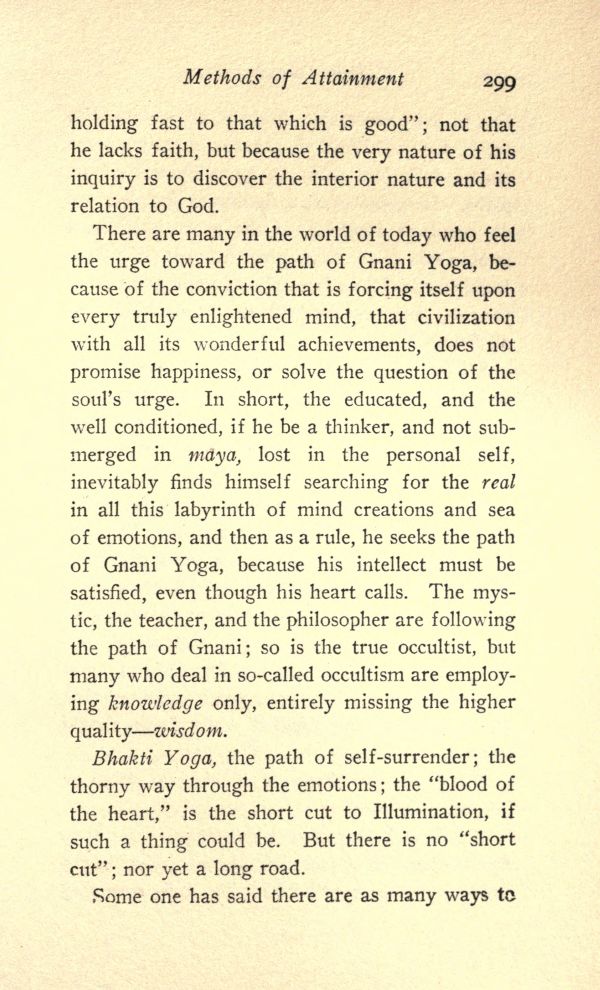 There are many in the world of to-day who feel the urge toward the path of Gnani Yoga, because of the conviction that is forcing itself upon every truly enlightened mind, that civilization with all its wonderful achievements, does not promise happiness, or solve the question of the soul's urge. In short, the educated, and the well conditioned, if he be a thinker, and not submerged in maya, lost in the personal self, inevitably finds himself searching for the real in all this labyrinth of mind creations and sea of emotions, and then as a rule, he seeks the path of Gnani Yoga, because his intellect must be satisfied, even though his heart calls. The mystic, the teacher, and the philosopher are following the path of Gnani; so is the true occultist, but many who deal in so-called occultism are employing knowledge only, entirely missing the higher quality-- wisdom.