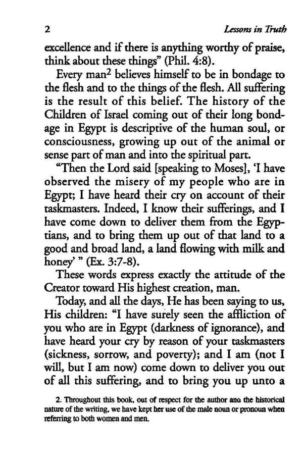 Every man 2 believes himself to be in bondage to the flesh and to the things of the flesh. All suffering is the result of this belief. The history of the Children of Israel coming out of their long bondage in Egypt is descriptive of the human soul, or consciousness, growing up out of the animal or sense part of man and into the spiritual part.