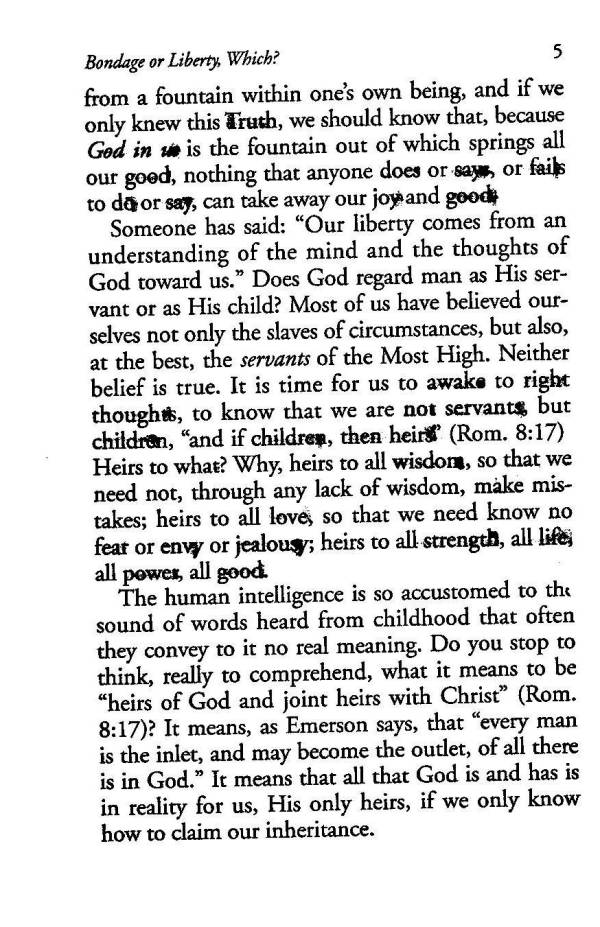 Someone has said: "Our liberty comes from an understanding of the mind and the thoughts of God toward us." Does God regard man as His servant or as His child? Most of us have believed ourselves not only the slaves of circumstances, but also, at the best, the servants of the Most High. Neither belief is true. It is time for us to awake to right though us, to know that we are not servants but children, "and if children, then heirs' (Rom. 8:17) Heirs to what? Why, heirs to all wisdom, so that we need not, through any lack of wisdom, make mistakes; heirs to all loves so that we need know no fear or envy or jealousy; heirs to all strength, all life, all power, all good.