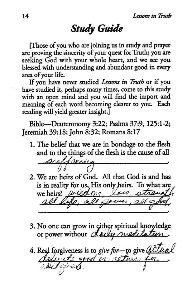 If you have never studied Lessons in Truth or if you have studied it, perhaps many times, come to this study with an open mind and you will find the import and meaning of each word becoming clearer to you. Each reading will yield greater insight.]