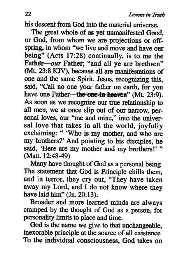 The great whole of as yet unmanifested Good, or God, from whom we are projections or offspring, in whom "we live and move and have our being" (Acts 17:28) continually, is to me the Father --- our Father, "and all ye are brethren" (Mt. 23:8 KJV), because all are manifestations of one and the same Spirit. Jesus, recognizing this, said, "Call no one your father on earth, for you have one Father --- the one in heaven" (Mt. 23:9). As soon as we recognize our true relationship to all men, we at once slip out of our narrow, personal loves, our "me and mine," into the universal love that takes in all the world, joyfully exclaiming: " 'Who is my mother, and who are my brothers?' And pointing to his disciples, he said, 'Here are my mother and my brothers!' " (Matt. 12:48-49)