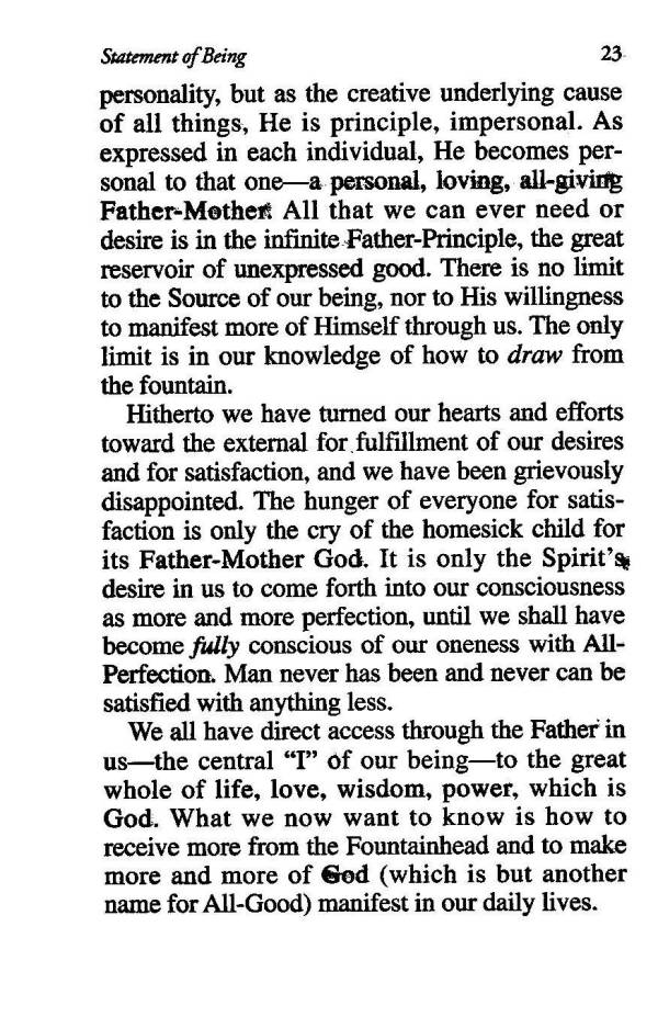 personality, but as the creative underlying cause of all things, He is principle, impersonal. As expressed in each individual, He becomes personal to that one --- a personal, loving, all-giving Father-Mother: All that we can ever need or desire is in the infinite Father-Principle, the great reservoir of unexpressed good. There is no limit to the Source of our being, nor to His willingness to manifest more of Himself through us. The only limit is in our knowledge of how to draw from the fountain.