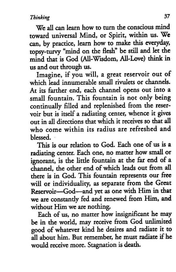 This is our relation to God. Each one of us is a radiating center. Each one, no matter how small or ignorant, is the little fountain at the far end of a channel, the other end of which leads out from all there is in God. This fountain represents our free will or individuality, as separate from the Great Reservoir --- God --- and yet as one with Him in that we are constantly fed and renewed from Him, and without Him we are nothing.