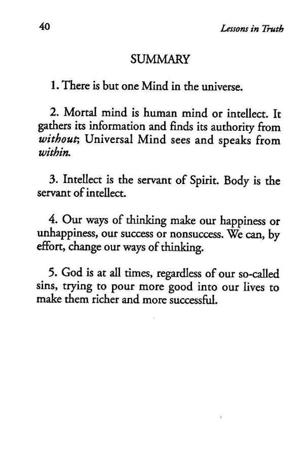 2. Mortal mind is human mind or intellect. It gathers its information and finds its authority from without; Universal Mind sees and speaks from within.