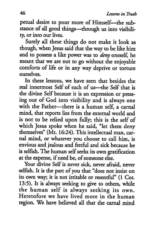 In these lessons, we have seen that besides the real innermost Self of each of us --- the Self that is the divine Self because it is an expression or pressing out of God into visibility and is always one with the Father --- there is a human self, a carnal mind, that reports lies from the external world and is not to be relied upon fully; this is the self of which Jesus spoke when he said, "let them deny themselves" (Mt. 16:24). This intellectual man, carnal mind, or whatever you choose to call him, is envious and jealous and fretful and sick because he is selfish. The human self seeks its own gratification at the expense, if need be, of someone else.