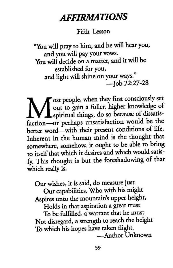 Most people, when they first consciously set out to gain a fuller, higher knowledge of spiritual things, do so because of dissatisfaction --- or perhaps unsatisfaction would be the better word --- with their present conditions of life. Inherent in the human mind is the thought that somewhere, somehow, it ought to be able to bring to itself that which it desires and which would satisfy. This thought is but the foreshadowing of that which really is.