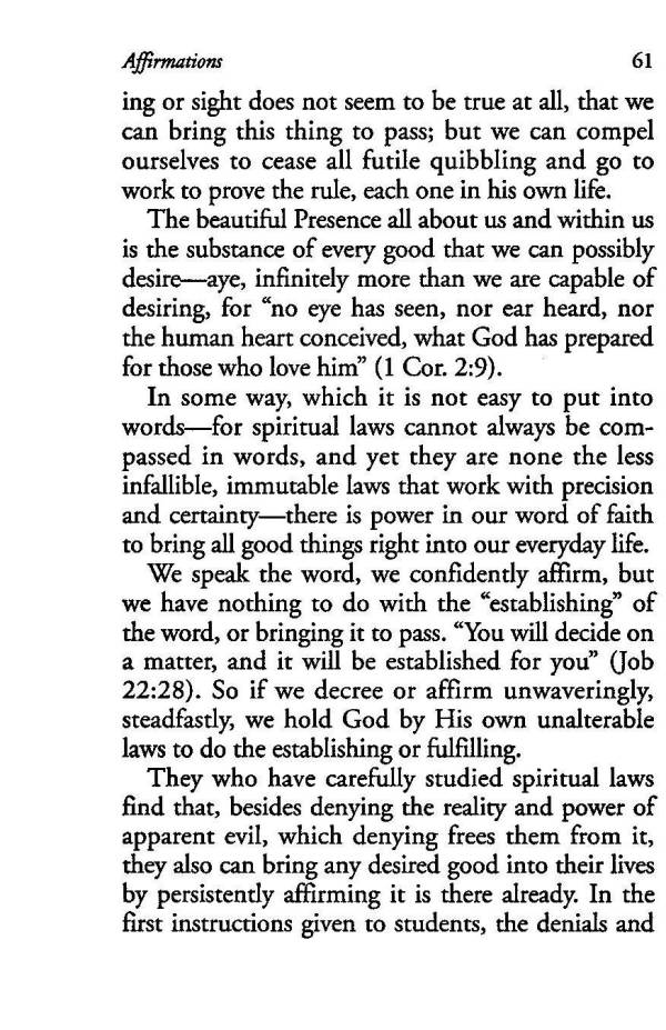 They who have carefully studied spiritual laws find that, besides denying the reality and power of apparent evil, which denying frees them from it, they also can bring any desired good into their lives by persistently affirming it is there already. In the first instructions given to students, the denials and