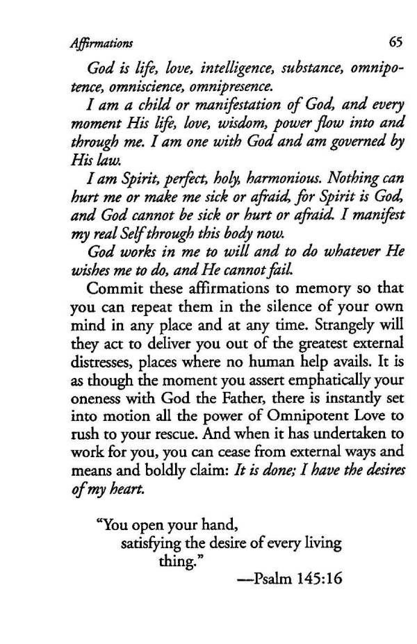 Commit these affirmations to memory so that you can repeat them in the silence of your own mind in any place and at any time. Strangely will they act to deliver you out of the greatest external distresses, places where no human help avails. It is as though the moment you assert emphatically your oneness with God the Father, there is instantly set into motion all the power of Omnipotent Love to rush to your rescue. And when it has undertaken to work for you, you can cease from external ways and means and boldly claim: It is done; I have the desires of my heart.