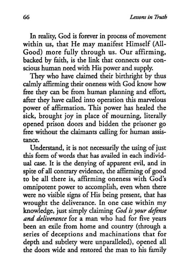 Understand, it is not necessarily the using of just this form of words that has availed in each individual case. It is the denying of apparent evil, and in spite of all contrary evidence, the affirming of good to be all there is, affirming oneness with God's omnipotent power to accomplish, even when there were no visible signs of His being present, that has wrought the deliverance. In one case within my knowledge, just simply claiming God is your defense and deliverance for a man who had for five years been an exile from home and country (through a series of deceptions and machinations that for depth and subtlety were unparalleled), opened all the doors wide and restored the man to his family