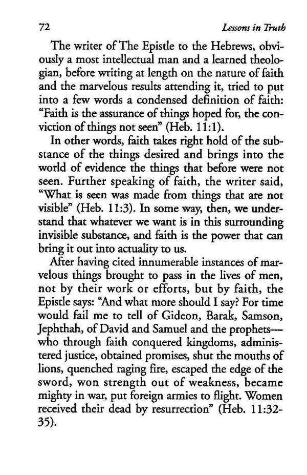 In other words, faith takes right hold of the substance of the things desired and brings into the world of evidence the things that before were not seen. Further speaking of faith, the writer said, "What is seen was made from things that are not visible" (Heb. 11:3). In some way, then, we understand that whatever we want is in this surrounding invisible substance, and faith is the power that can bring it out into actuality to us.