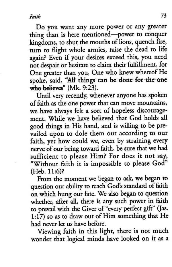 Until very recently, whenever anyone has spoken of faith as the one power that can move mountains, we have always felt a sort of hopeless discouragement. While we have believed that God holds all good things in His hand, and is willing to be prevailed upon to dole them out according to our faith, yet how could we, even by straining every nerve of our being toward faith, be sure that we had sufficient to please Him? For does it not say, "Without faith it is impossible to please God" (Heb. 11:6)?
